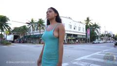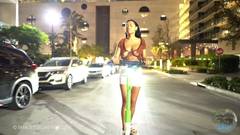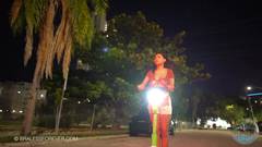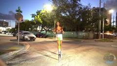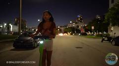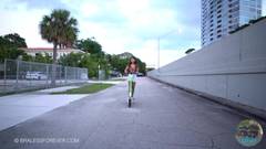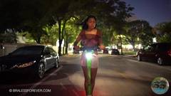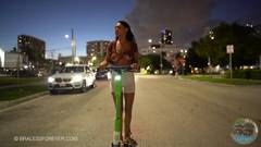 À noite, ela usa seu skate para mostrar seus peitos na rua.