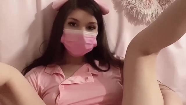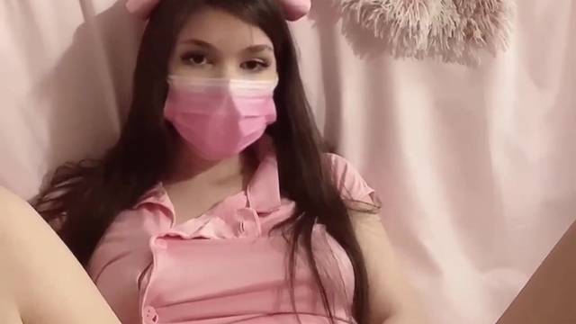 Ela está linda tocando sua buceta na câmera com sua máscara rosa