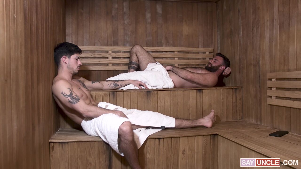 No sauna, esses homens fazem um pouco de conversa leve, mas rapidamente a discussão os leva a chuparem-se mutuamente o pau