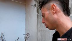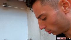 Jóevnes latinos gays fazendo um trio com o vizinho no pátio
