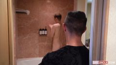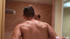 Seu padrasto o pega na punheta e se junta nu no chuveiro