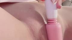 Uma tomada fechada da sua cona virgem enquanto a estimula com um dildo