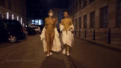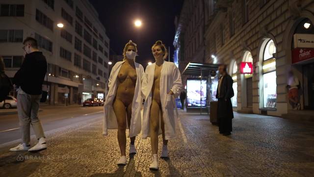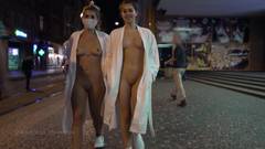 Duas primas saem nuas para caminhar pelas ruas para nos desafiarem