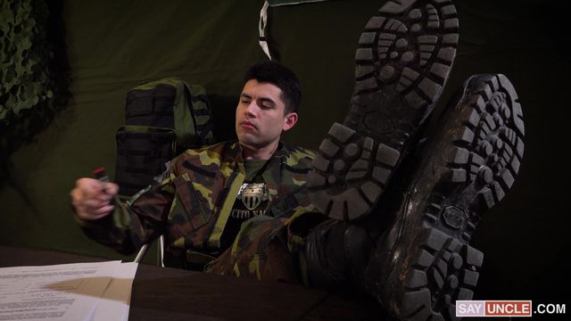 O sargento surpreende seu subordinado usando sua jaqueta e sentado em sua cadeira, então como castigo, ele deve se ajoelhar e chupar o pau como uma garota!