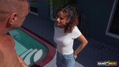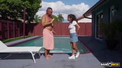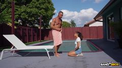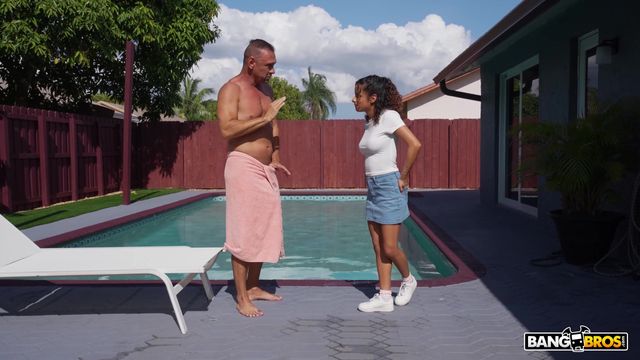 Isabella Jules surpreende seu padrasto Peter nu à beira da piscina, maravilhada por sua grande pica. Ela o masturba e o chupa, mal cabe em sua boca.