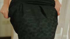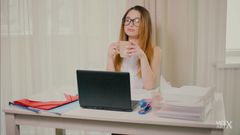 Susie de óculos se masturba no trabalho em casa, se despe para mostrar sua buceta e separa seus grandes lábios rosados enquanto enfia os dedos freneticamente.
