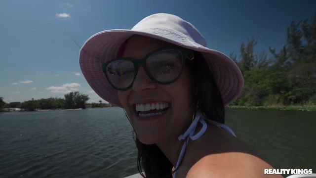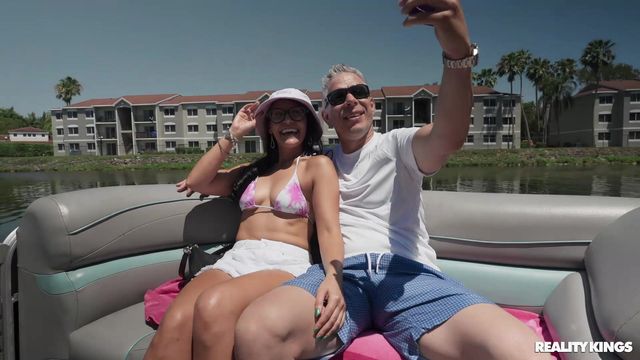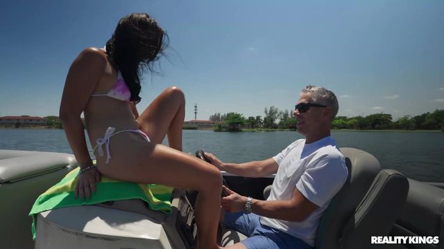 Jade Green se excita no barco de Mick Blue, enquanto ele tira fotos e a unge com óleo. Depois, ela se faz meter os dedos na buceta.