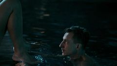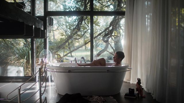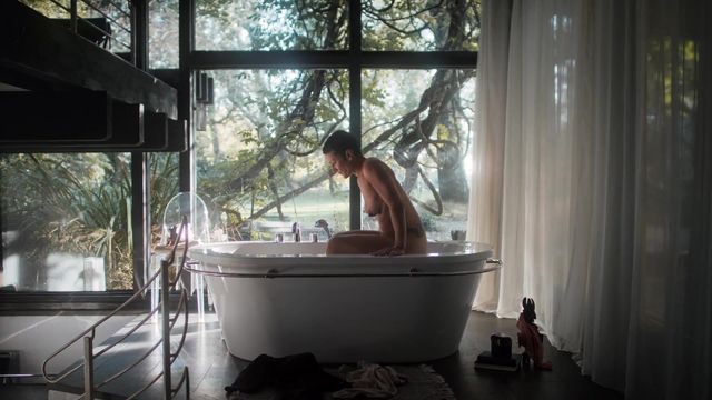 MILF de cabelo curto toma um banho, fantasiando com uma foda erótica na piscina no meio das plantas e sobre a mesa onde os machos a fodem forte.