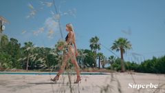 Lesya M, loira de corpo perfeito, exibe seu traje de banho em uma piscina abandonada. Ela revela suas grandes tetas e sua buceta apertada.