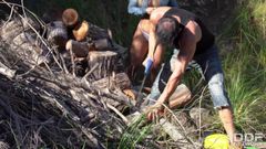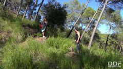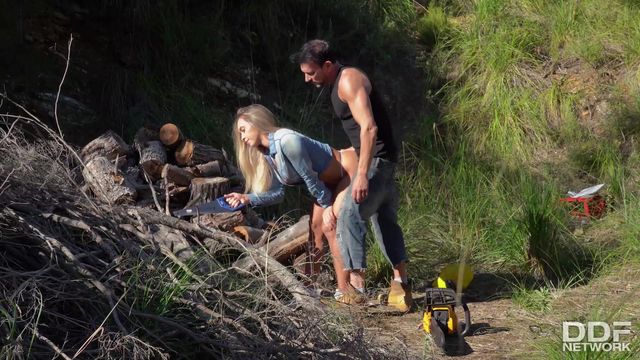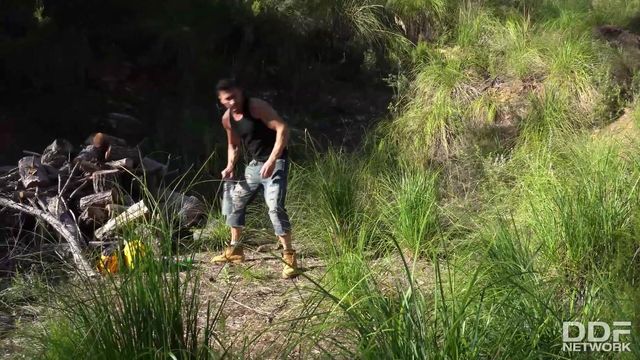 A peituda Briana Banderas toma sol nua na floresta. Quando cheira a fumaça de uma fogueira, vai até lá e conhece um lenhador que a fode ao ar livre!