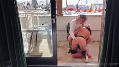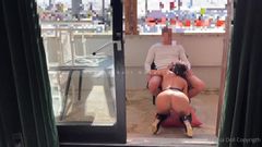 Esta bela mulher francesa mascarada chupa o pau de um cara na varanda, seus lábios chupam até o fundo, o sêmen sai a jorros e ela engole quase tudo.