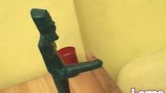 Esta morena adolescente e bonita está usando os óculos, excitada e sozinha, então ela busca uma pequena estátua e se masturba com ela, o que a excita muito.