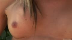 Esse transexual sexy está no jardim vestindo sua lingerie vermelha e sexy quando decide se masturbar e gozar toda sobre si mesma.