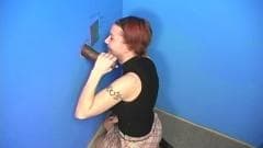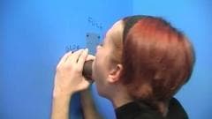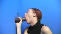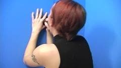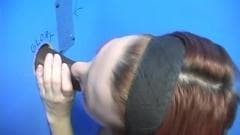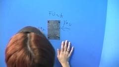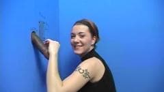 Ela está em um quarto azul, onde há um buraco estranho na parede, de onde sai um pau negro para fora e que vai estourar em seu rosto.