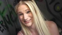 Essa loira safada está chupando pau através de um gloryhole em um banheiro nojento, mas ela não se importa porque ela só quer ter a boca cheia de pau!