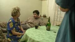 Estamos numa reunião entre amigos. O mais novo está excitado e vai ter a sorte de levar uma mamada por esta velha porca.