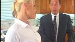 Ela encontro-o na cozinha e oferece sua buceta para ele em troca de dinheiro, que ele obviamente aceita e eles fodem na bancada da cozinha.