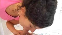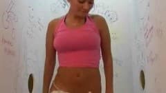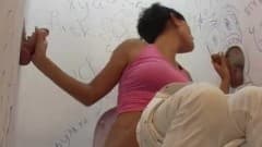 Morena vai ao banheiro para encontrar surpresa...dois pintos em buracos de glória.