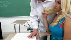 Ele está tentando ensinar essa loira a lição do dia, mas não é fácil resistir às suas insinuações sexuais e às a suas tetas naturais gostosas!