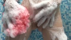 Esta bela jovem se molha enquanto ainda está vestida no chuveiro. Em seguida, ela se despe e se masturba na frente da câmera com um monte de sabão!