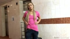 Como é belo este bichano adolescente loiro! Ela está sentada com as pernas bem abertas e se divertindo muito bem. mesmo sozinha.