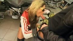 Bela loira com grandes mamas transa com motociclista.