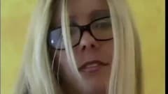 Loira maluca com óculos fuma um cigarro enquanto sopra, ela o faz muito relaxada e é uma profissional