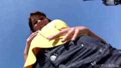 Ela gosta de se acariciar com vontade durante esta cena onde enfia um objeto em seu bichano enquanto se delicia com o calor do sol amaciando seu corpo