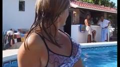 Mientras esta morena toma el sol en la piscina, llegan dos vecinos que saben muy bien lo que van a hacer y la penetran con sus pollas para complacerla