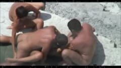 Estamos numa praia de nudismo. 4 pessoas excitadas vão fazer sexo na praia sem eles saber que uma camara está a filmar.