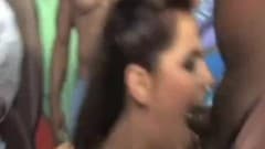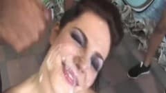 Temos neste video uma morena bem feitinha que vai ter que lidar com um grupo de gajos com vontade de brincar a jogos porcos. Ela vai comer com fartura o precioso liquido.