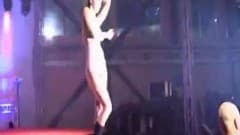 Este sortudo espectador é trazido ao palco durante este espetáculo e fica com um dildo preso na boca no qual uma morena está pulando