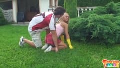 Esta bela loira está cuidando das flores em seu jardim quando seu vizinho chega de surpresa e está querendo tirar proveito do seu corpo...