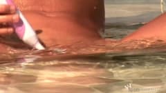 Esta loira está nua na piscina e quer se masturbar, mas não encontra o seu vibrador, assim que procura uma escova de dentes com vibração...