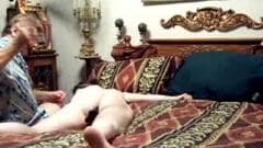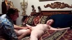 Esse cara tem visto muitos filmes pornográficos e quer experimentar algo do que tem visto com sua mulher. Ela está nua e amarrada na cama...