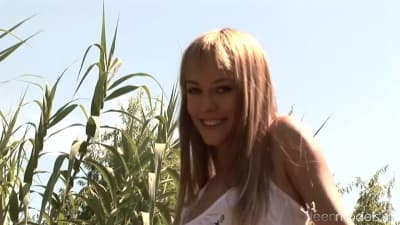 Esta bela loira está querendo sentir em seu corpo o máximo de excitação sexual e está sozinha, então decide tocar seus seios e sua buceta ao ar livre!
