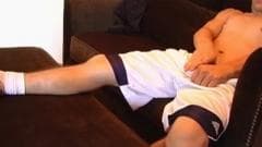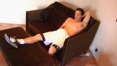 Este homem quer tirar o pau de dentro das calças e se masturbar sozinho para satisfazer o seu apetite sexual no conforto do sofá da sala...