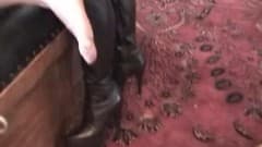 Aquela loira madura está se divertindo. Ela mantém seu marido em segurança em uma gaiola.
