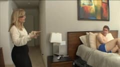 A coroa chega em casa e ouve ruído saindo de seu quarto. Ela surpreende o namorado da filha tocando punheta e acaba convencendo-o a foder...