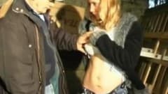 Uma jovem puta está sendo fodida por estes dois caras aqui. No celeiro, elas não são observadas enquanto fodem com força a jovem puta