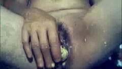 Esta mulher chefe de cozinha adora brincar com alimentação na sua buceta.