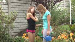 Duas meninas gostosas andam no jardim e elas começam então a tocar-se e a enfiar os dedos na buceta de uma e outra. é mesmo um puro momento de sexo.