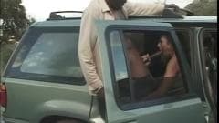 Esta mulher masturba-se no carro com um enorme caralho preto quando um homem passa por ai e vê tudo o que se passa e parece que quer participar.