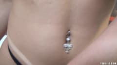 Uma pequena loira que não é outro senão um travesti com seios grandes e uma bunda grande que bate uma boa punheta em frente a câmera até ejacular!