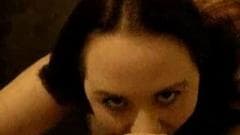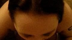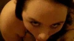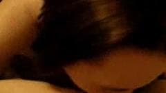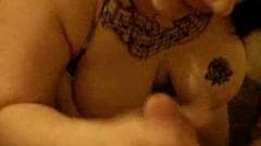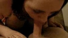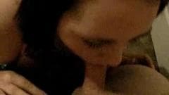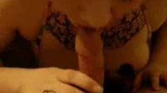 Ela sabe do que seu marido gosta e que ela gosta de ter seu pau na boca e na garganta. Ele se masturba nas mamas dela.