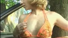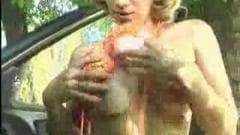 A bela loira está se prepara para dar um belo boquete ao namorado dela no carro e estar ao ar livre no carro dá mais tesão.
