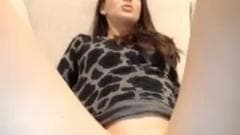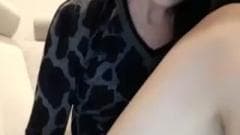 Ela sente-se confortavel com as pernas abertas no sofá, esfregando seu clitóris e dedilhando sua buceta para ficar úmida e completamente excitada.