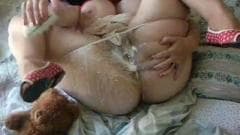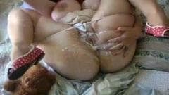 Esta puta gorda adora ser o centro das atenções e é por isso que ela está na sua cama com as pernas bem abertas e cobrindo-se de creme.