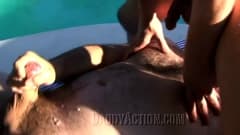 Este trio é muito emocionante com dois rapazes e um cara maduro fazendo sexo gay fora da piscina, eles não param até se vir.