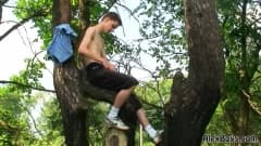 Jovem gay está de férias e decide fazer uma caminhada no campo! Ele encontra um lugar tranquilo para se sentar e se masturbar sozinho ao ar livre.
